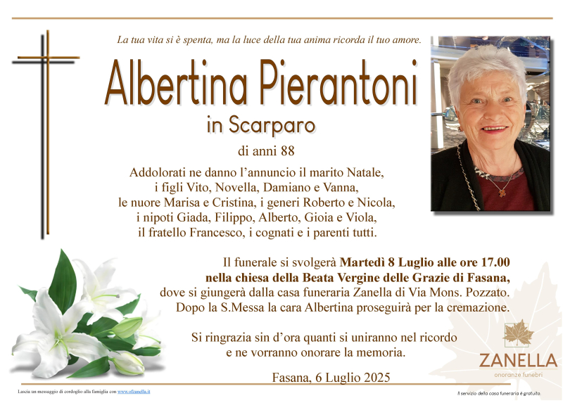 Daremo l’ultimo saluto alla cara ALBERTINA PIERANTONI in SCARPARO Martedì 8 Luglio alle ore 17.00 nella chiesa della Beata Vergine delle Grazie di Fasana, dove si giungerà dalla casa funeraria Zanella. Al termine si proseguirà per la cremazione.