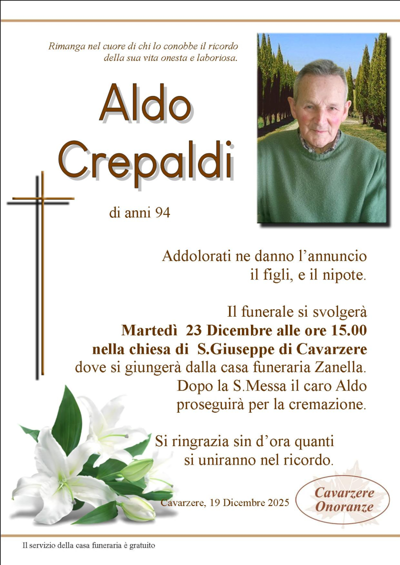 Daremo l’ultimo saluto al caro ALDO CREPALDI Martedì 23 Dicembre alle ore 15.00 nella chiesa di S.Giuseppe di Cavarzere, dove si giungerà dalla casa funeraria Zanella. Al termine si proseguirà per la cremazione.