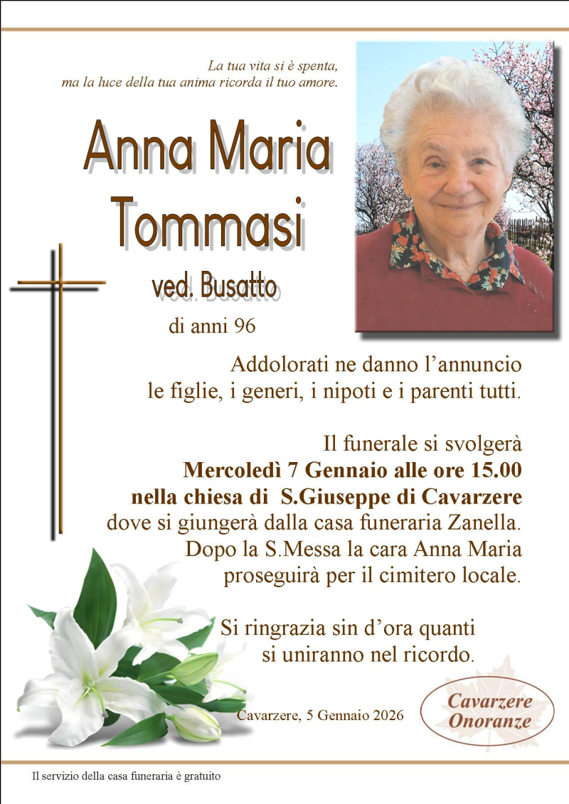 Daremo l’ultimo saluto alla cara ANNA MARIA TOMMASI ved. BUSATTO Mercoledì 7 Gennaio alle ore 15.00 nella chiesa di S.Giuseppe di Cavarzere, dove si giungerà dalla casa funeraria Zanella. Al termine si proseguirà per il cimitero locale.