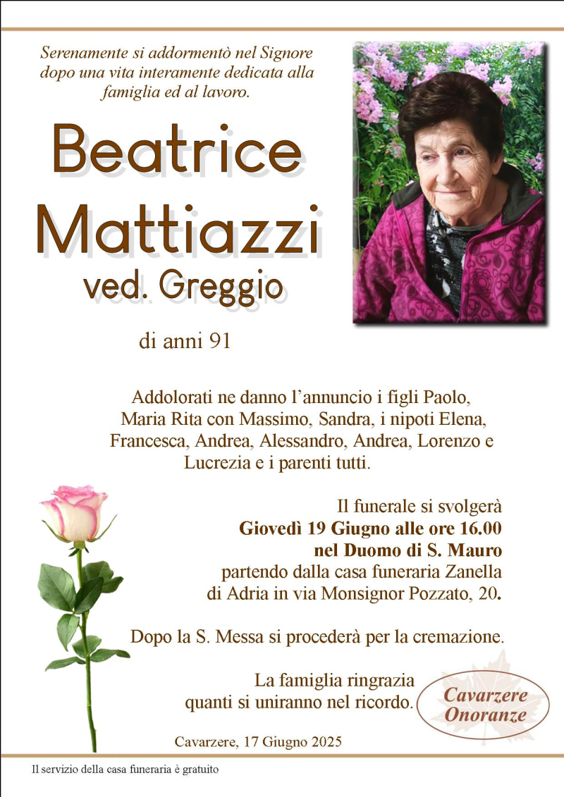 Daremo l’ultimo saluto alla cara BEATRICE MATTIAZZI ved. GREGGIO ANTONIO Giovedì 19 Giugno alle ore 16.00 nel Duomo di San Mauro di Cavarzere dove si giungerà dalla casa funeraria Zanella. Al termine si proseguirà per la cremazione.