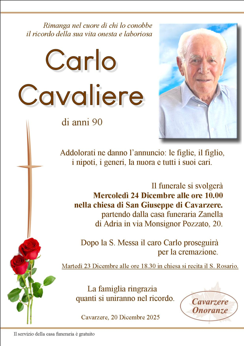 Daremo l’ultimo saluto al caro CARLO CAVALIERE Mercoledì 24 Dicembre alle ore 10.00 nella chiesa di S.Giuseppe di Cavarzere, dove si giungerà dalla casa funeraria Zanella. Al termine si proseguirà per la cremazione.