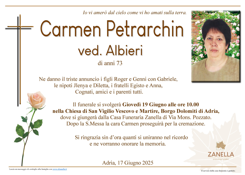 Daremo l’ultimo saluto alla cara CARMEN PETRARCHIN ved. ALBIERI Giovedì 19 Giugno alle ore 10.00 nella Chiesa di San Vigilio Vescovo e Martire, Borgo Dolomiti di Adria dove si giungerà dalla casa funeraria Zanella. Al termine si proseguirà per la cremazione.