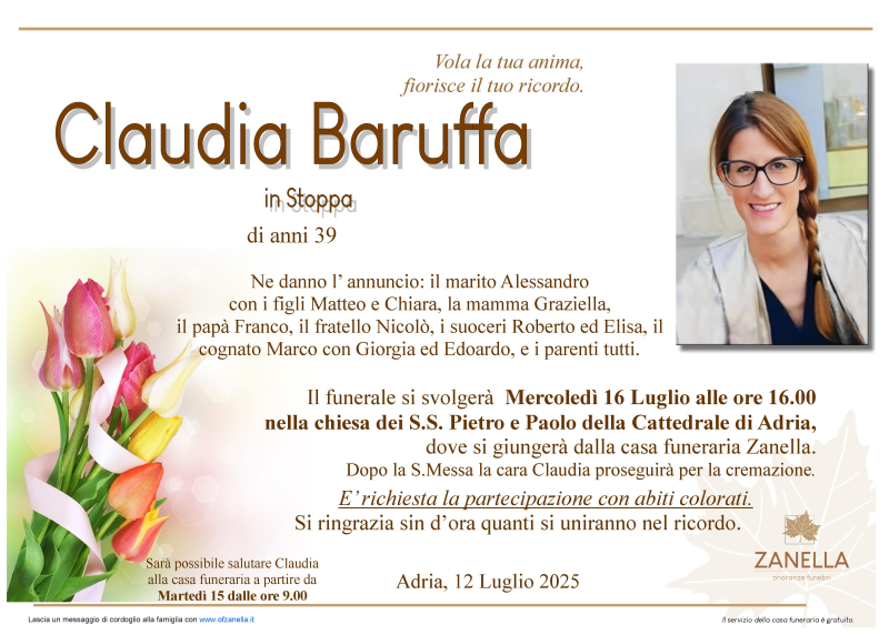 Daremo l’ultimo saluto alla cara CLAUDIA BARUFFA mercoledì 16 Luglio alle ore 16.00 nella Cattedrale dei S.S. Pietro e Paolo di Adria, dove si giungerà dalla casa funeraria Zanella. Al termine si proseguirà per la cremazione.