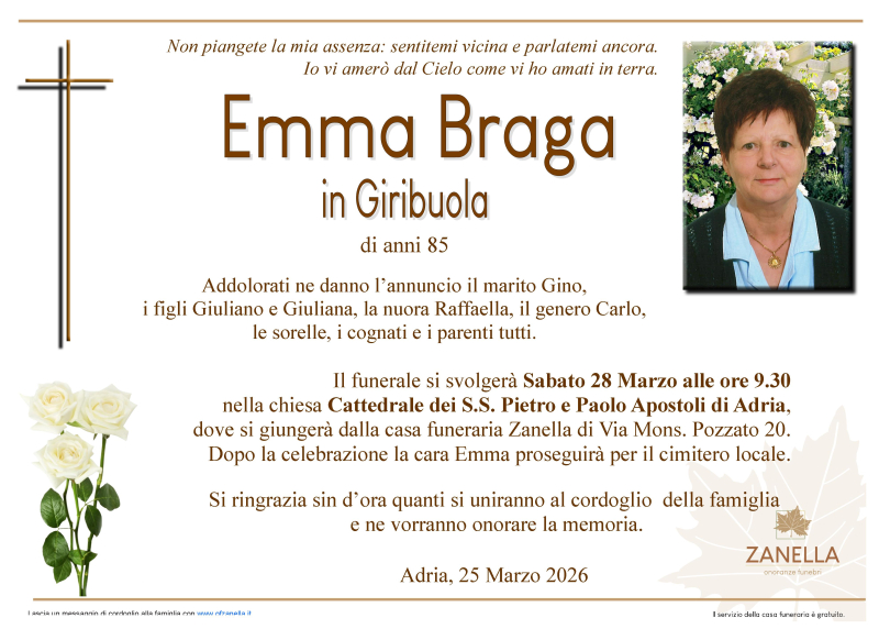 Daremo l’ultimo saluto alla cara EMMA BRAGA in GIRIBUOLA Sabato 28 Marzo alle ore 9.30 nella Cattedrale dei S.S. Pietro e Paolo di Adria, dove si giungerà dalla casa funeraria Zanella. Al termine si proseguirà per il cimitero locale.