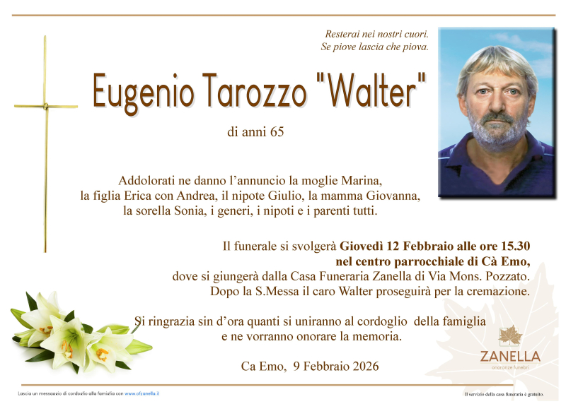 Daremo l’ultimo saluto al caro WALTER EUGENIO TAROZZO Giovedì 12 Febbraio alle ore 15.30 nel centro parrocchiale di CA’ EMO, dove si giungerà dalla casa funeraria Zanella. Al termine si proseguirà per la cremazione.