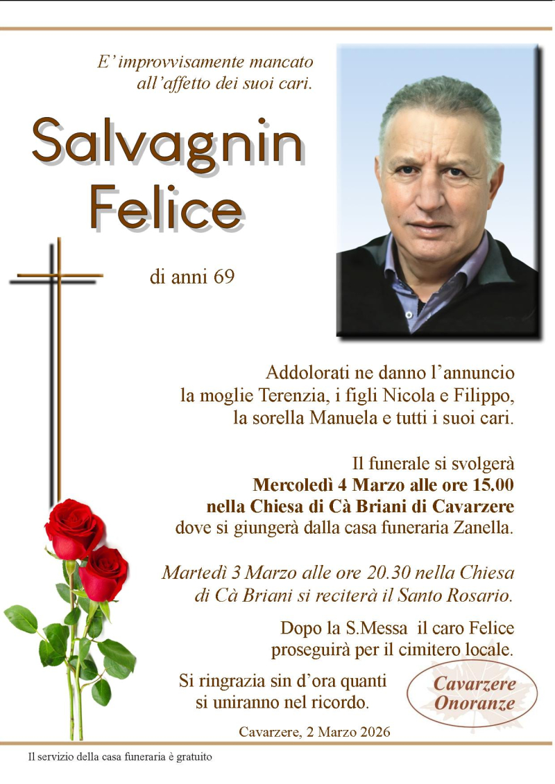 Daremo l’ultimo saluto al caro FELICE SALVAGNIN Mercoledì 4 Marzo alle ore 15.00 nella chiesa di CA’ BRIANI di Cavarzere, dove si giungerà dalla casa funeraria Zanella. Al termine si proseguirà per il cimitero locale.