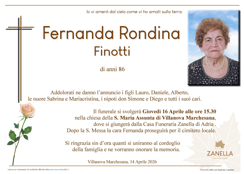 Daremo l’ultimo saluto alla cara FERNANDA RONDINA FINOTTI Giovedì 16 Aprile alle ore 15.30 nella chiesa della S.Maria Assunta di Villanova Marchesana, dove si giungerà dalla casa funeraria Zanella. Al termine si proseguirà per per il cimitero locale.
