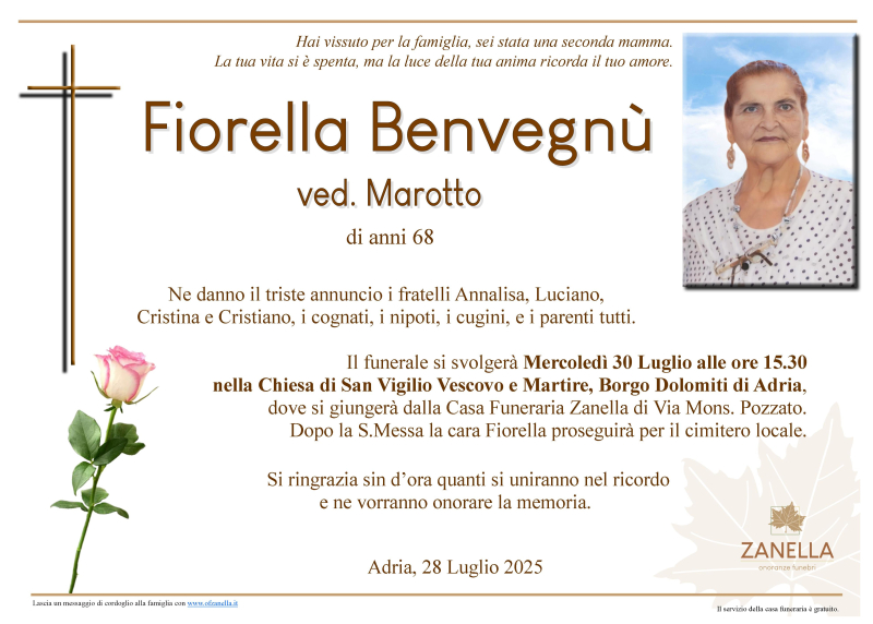 Daremo l’ultimo saluto alla cara FIORELLA BENVEGNU’ ved. Marotto Mercoledì 30 Luglio alle ore 15.30 nella Chiesa di San Vigilio Vescovo e Martire, Borgo Dolomiti di Adria, dove si giungerà dalla Casa Funeraria Zanella di Via Mons. Pozzato. Al termine si proseguirà per il cimitero locale.