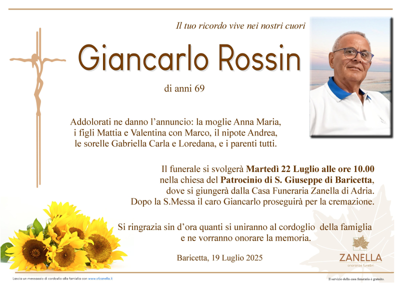 Daremo l’ultimo saluto al caro GIANCARLO ROSSIN Martedì 22 Luglio alle ore 10.00 nella chiesa del Patrocinio di S. Giuseppe di Baricetta, dove si giungerà dalla casa funeraria Zanella. Al termine si proseguirà per la cremazione.