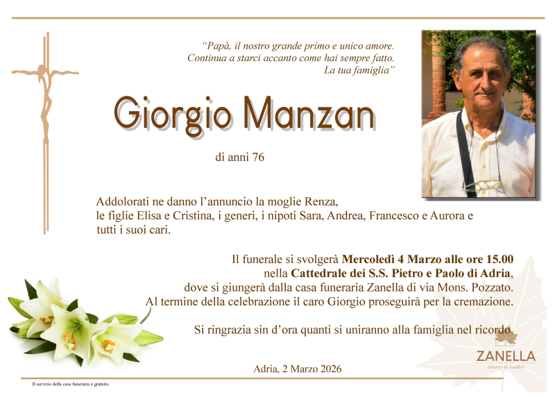 Daremo l’ultimo saluto al caro GIORGIO MANZAN Marcoledì 4 Marzo alle ore 15.00 nella Cattedrale dei S.S. Pietro e Paolo di Adria, dove si giungerà dalla casa funeraria Zanella. Al termine si proseguirà per la cremazione.