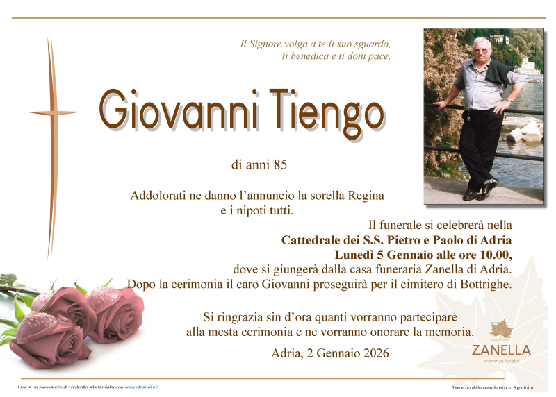 Daremo l’ultimo saluto al caro GIOVANNI TIENGO Lunedì 5 Gennaio alle ore 10.00 nella Cattedrale dei S.S. Pietro e Paolo di Adria, dove si giungerà dalla casa funeraria Zanella. Al termine si proseguirà per il cimitero di Bottrighe.