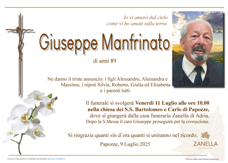 Daremo l’ultimo saluto al caro GIUSEPPE MANFRINATO Venerdì 11 Luglio alle ore 10.00 nella chiesa dei S.S. Bartolomeo e Carlo di Papozze, dove si giungerà dalla casa funeraria Zanella. Al termine si proseguirà per la cremazione.
