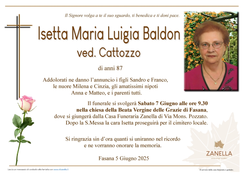 Daremo l’ultimo saluto alla cara ISETTA MARIA LUIGIA BALDON ved. CATTOZZO Sabato 7 Giugno alle ore 9.30 nella Chiesa della Beata Vergine delle Grazie di Fasana dove si giungerà dalla casa funeraria Zanella. Al termine si proseguirà per il cimitero locale.