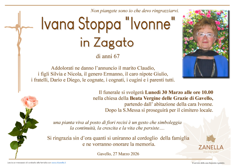 Daremo l’ultimo saluto alla cara IVONNE STOPPA in ZAGATO Lunedì 30 Marzo alle ore 10.00 nella Chiesa della Beata Vergine delle Grazie di Gavello, dove si giungerà dall’abitazione della famiglia. Al termine si proseguirà per il cimitero locale.