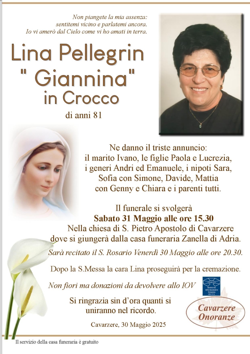 Daremo l’ultimo saluto alla cara LINA PELLEGRIN “Giannina” in CROCCO Sabato 31 Maggio alle ore 15.30 nella chiesa di san Pietro Apostolo di Cavarzere, dove si giungerà dalla casa funeraria Zanella. Al termine si proseguirà per la cremazione.