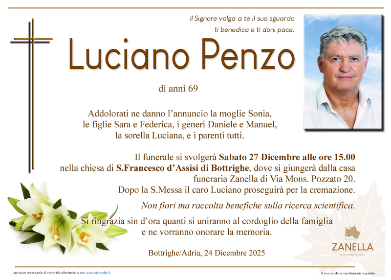 Daremo l’ultimo saluto al caro LUCIANO PENZO Sabato 27 Dicembre alle ore 15.00 nella chiesa di S.Francesco d’Assisi di Bottrighe, dove si giungerà dalla casa funeraria Zanella. Al termine si proseguirà per la cremazione.