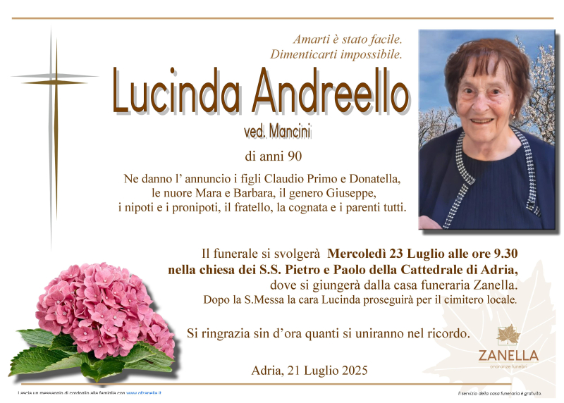 Daremo l’ultimo saluto alla cara LUCINDA ANDREELLO ved. MANCINI Mercoledì 23 Luglio alle ore 9.30 nella chiesa dei S.S. Pietro e Paolo della Cattedrale di Adria, dove si giungerà dalla casa funeraria Zanella. Al termine si proseguirà per il cimitero locale.