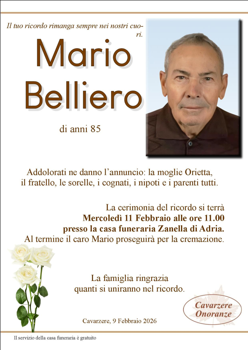 Daremo l’ultimo saluto al caro MARIO BELLIERO Mercoledì 11 Febbraio alle ore 11.00 presso la sala del commiato della casa funeraria Zanella. Al termine si proseguirà per la cremazione.