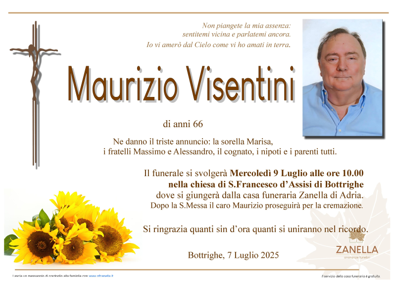 Daremo l’ultimo saluto al caro MAURIZIO VISENTINI Mercoledì 9 Luglio alle ore 10.00 nella chiesa di S.Francesco d’Assisi di Bottrighe, dove si giungerà dalla casa funeraria Zanella. Al termine si proseguirà per la cremazione.