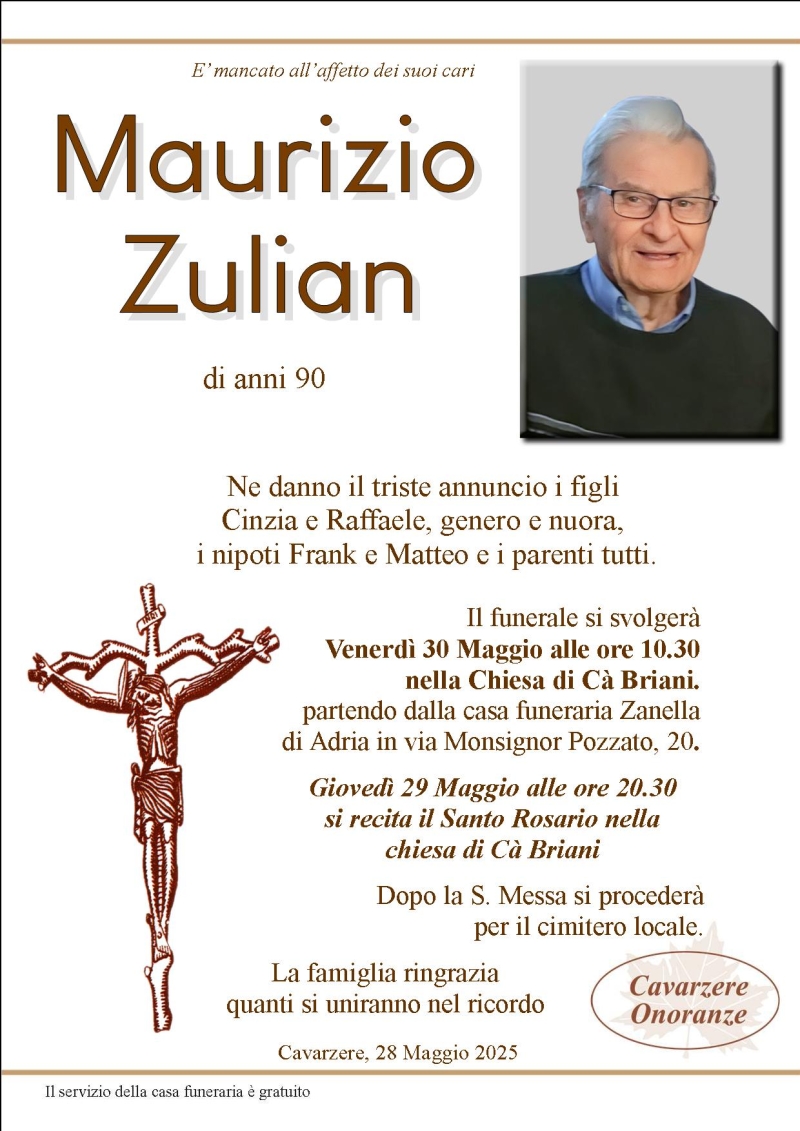 Daremo l’ultimo saluto al caro MAURIZIO ZULIAN Venerdì 30 Maggio alle ore 10.30 nella chiesa di Cà Briani di Cavarzere, dove si giungerà dalla casa funeraria Zanella. Al termine si proseguirà per il cimitero locale.