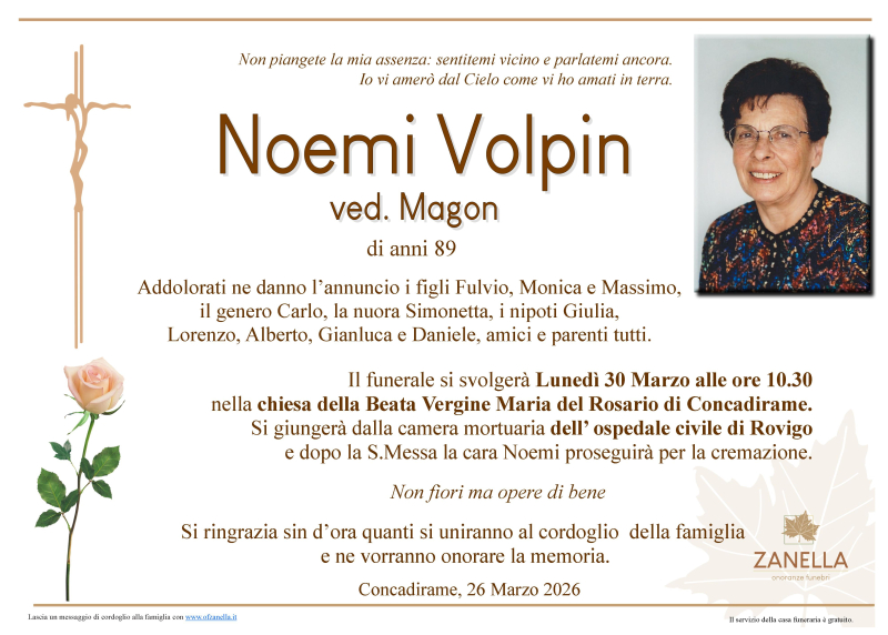 Daremo l’ultimo saluto alla cara NOEMI VOLPIN ved. MAGON Lunedì 30 Marzo alle ore 10.30 nella chiesa Beata Vergine del Rosario di Concadirame, dove si giungerà dalla camera mortuaria dell’Ospedale di Rovigo. Al termine si proseguirà per la cremazione.