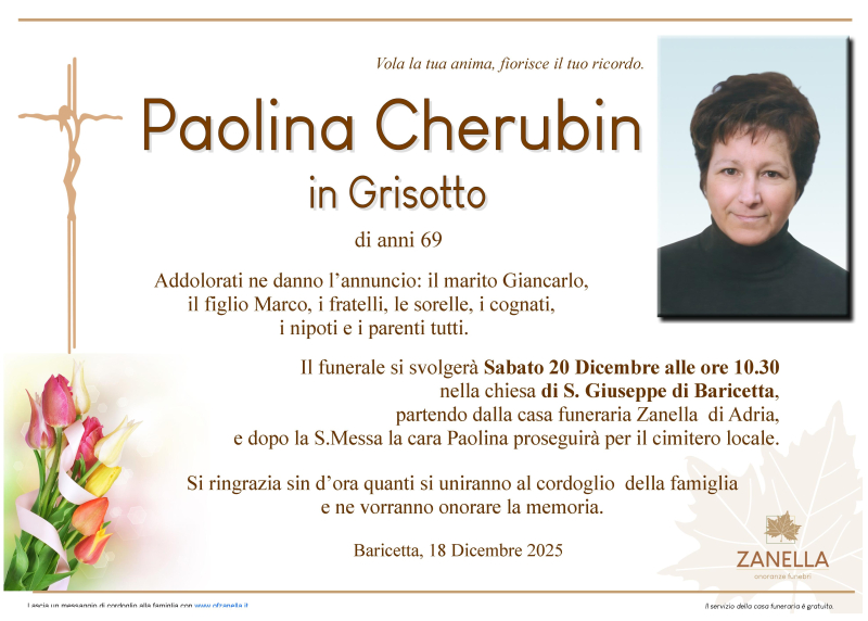 Daremo l’ultimo saluto alla cara PAOLINA CHERUBIN in GRISOTTO Sabato 20 Dicembre alle ore 10.30 nella chiesa di S.Giuseppe di Baricetta, dove si giungerà dalla casa funeraria Zanella. Al termine si proseguirà per il cimitero locale.