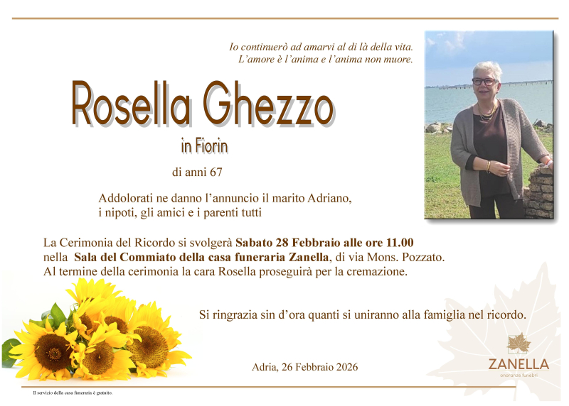 La Cerimonia del Ricordo alla cara ROSELLA GHEZZO si svolgerà Sabato 28 Febbraio alle ore 11.00 nella Sala del Commiato della casa funeraria Zanella. Al termine si proseguirà per la cremazione.