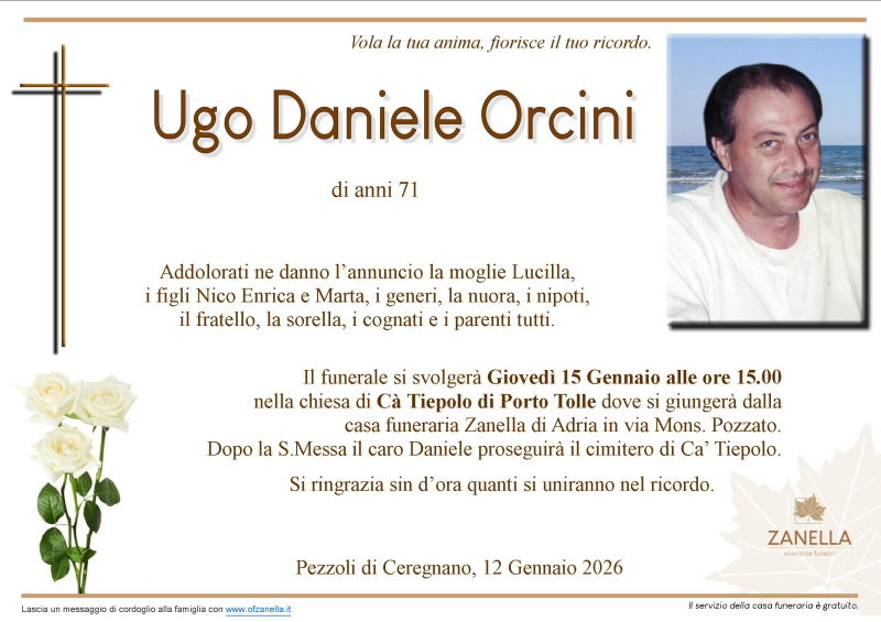 Daremo l’ultimo saluto al caro UGO DANIELE ORCINI Giovedì 15 Gennaio alle ore 15.00 nella chiesa di Cà Tiepolo a Porto Tolle dove si giungerà dalla casa funeraria Zanella. Al termine si proseguirà per il cimitero locale.
