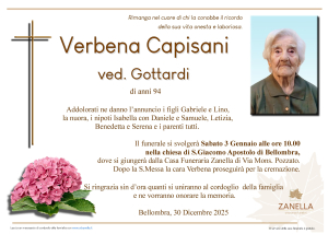 Daremo l’ultimo saluto alla cara VERBENA CAPISANI ved. GOTTARDI Sabato 3 Gennaio alle ore 10.00 nella chiesa di S.Giacomo Apostolo di Bellombra, dove si giungerà dalla casa funeraria Zanella. Al termine si proseguirà per la cremazione.