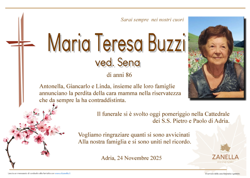 Antonella, Giancarlo e Linda SENA, insieme alle loro famiglie annunciano la perdita della cara mamma nella riservatezza che da sempre la ha contraddistinta. Il funerale si è svolto oggi pomeriggio nella Cattedrale dei S.S. Pietro e Paolo di Adria. Vogliamo ringraziare quanti si sono avvicinati Alla nostra famiglia e si sono uniti nel ricordo.