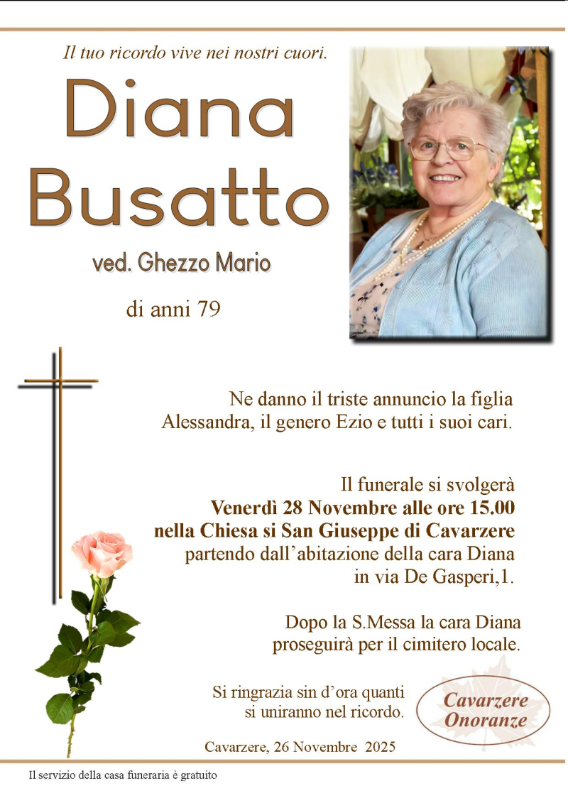 Daremo l'ultimo saluto alla cara DIANA BUSATTO ved. GHEZZO Venerdì 28 Novembre alle ore 15.00 nella di S.Giuseppe di Cavarzere, dove si giungerà dall'abitazione della famiglia di via De Gasperi 1. Al termine si proseguirà per il cimitero locale.