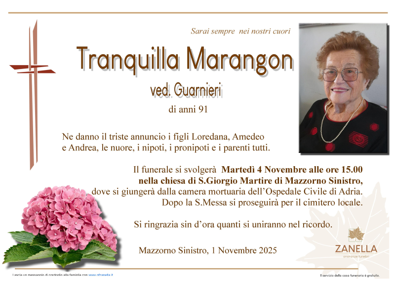 Daremo l'ultimo saluto alla cara TRANQUILLA MARANGON ved. GUARNIERI Martedì 4 Novembre alle ore 15.00 nella Chiesa di S.Giorgio Martire di Mazzorno Sinistro dove si giungerà dalla camera mortuaria dell'Ospedale Civile di Adria. Al termine si proseguirà per il cimitero locale.