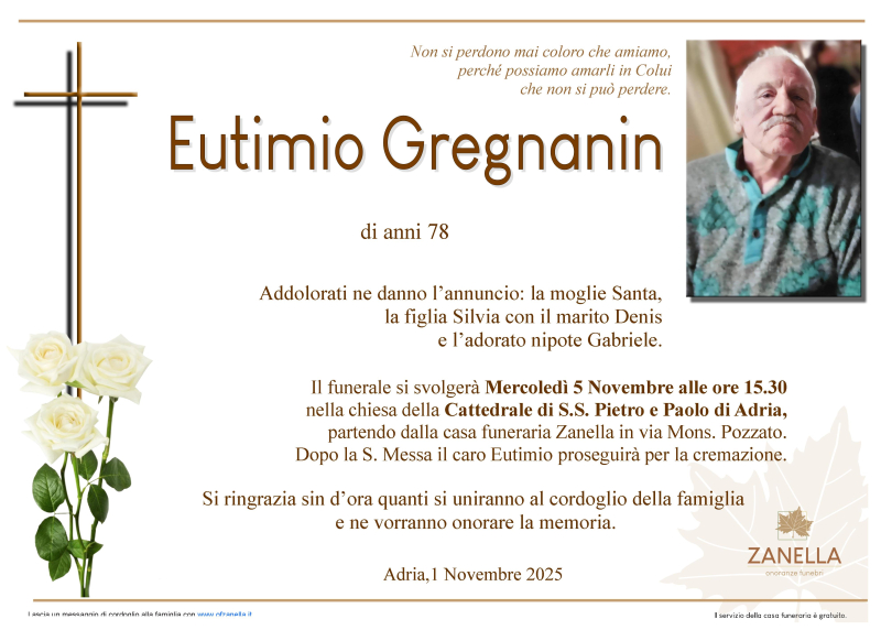 Daremo l'ultimo saluto al caro EUTIMIO GREGNANIN Mercoledì 5 Novembre alle ore 15.30 nella Cattedrale dei S.S. Pietro e Paolo di Adria dove si giungerà dalla casa funeraria Zanella. Al termine si proseguirà per la cremazione.