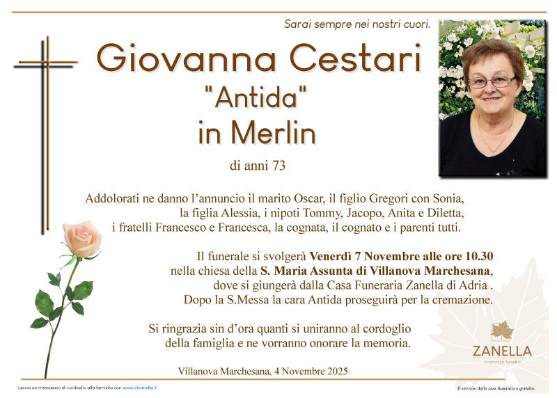 Daremo l'ultimo saluto alla cara GIOVANNA CESTARI in Merlin Oscar Venerdì 7 Novembre alle ore 10.30 nella chiesa della S. Maria Assunta di Villanova Marchesana, dove si giungerà dalla casa funeraria Zanella. Al termine si proseguirà per la cremazione.