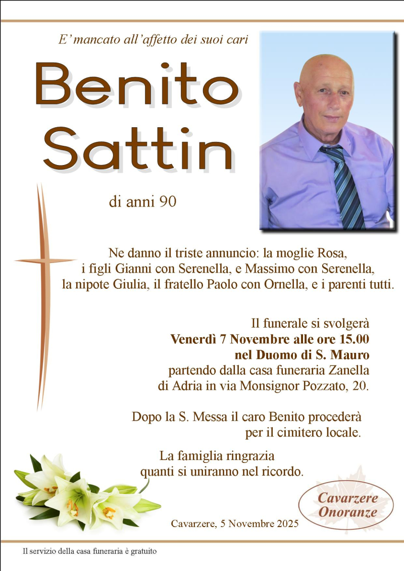 Daremo l'ultimo saluto al caro BENITO SATTIN Venerdì 7 Novembre alle ore 15.00 nel Duomo di S. Mauro, dove si giungerà dalla casa funeraria Zanella. Al termine si proseguirà per il cimitero locale.