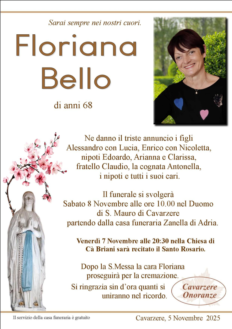 Daremo l'ultimo saluto alla cara FLORIANA BELLO Sabato 8 Novembre alle ore 10.00 nel Duomo di S. Mauro, dove si giungerà dalla casa funeraria Zanella. Al termine si proseguirà per la cremazione.