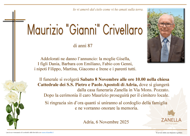 Daremo l'ultimo saluto al caro MAURIZIO GIANNI CRIVELLARO Sabato 8 Novembre alle ore 10.00 nella Cattedrale dei S.S. Pietro e Paolo di Adria dove si giungerà dalla casa funeraria Zanella. Al termine si proseguirà per il cimitero locale.