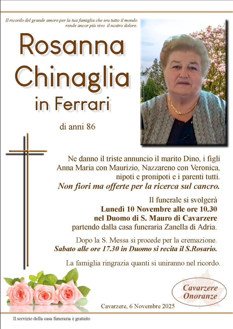 Daremo l'ultimo saluto alla cara ROSANNA CHINAGLIA in Ferrari Lunedì 10 Novembre alle ore 10.30 nel Duomo di S. Mauro, dove si giungerà dalla casa funeraria Zanella. Al termine si proseguirà per la cremazione.