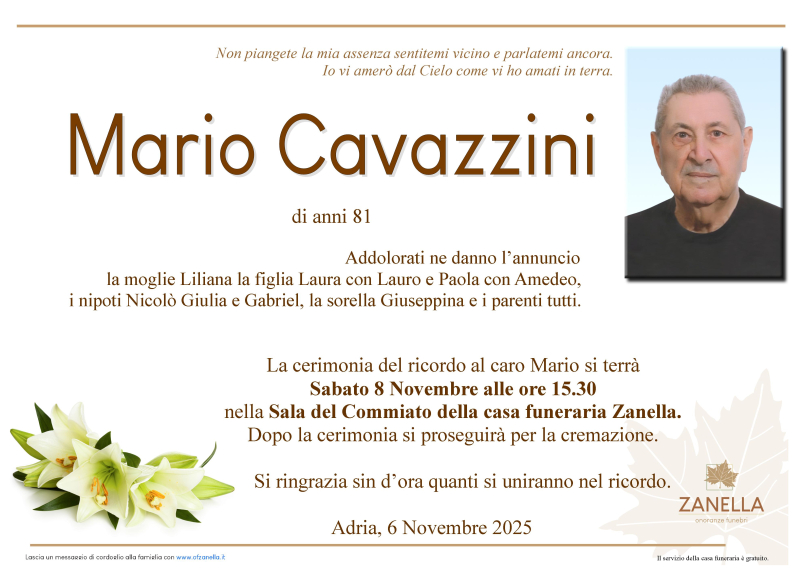 Daremo l'ultimo saluto al caro MARIO CAVAZZINI Sabato 8 Novembre alle ore 15.30 nella Sala del Commiato della casa funeraria Zanella. Al termine si proseguirà per la cremazione.