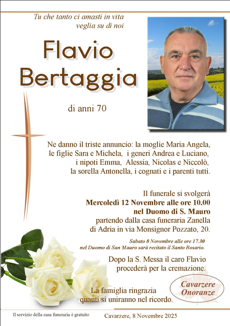 Daremo l'ultimo saluto al caro FLAVIO BERTAGGIA Mercoledì 12 Novembre alle ore 10.00 nel Duomo di S. Mauro, dove si giungerà dalla casa funeraria Zanella. Al termine si proseguirà per la cremazione.