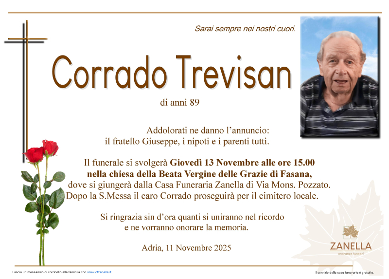 Daremo l'ultimo saluto al caro CORRADO TREVISAN Giovedì 13 Novembre alle ore 15.00 nella chiesa della Beata Vergine delle Grazie di Fasana dove si giungerà dalla casa funeraria Zanella. Al termine si proseguirà per il cimitero locale.