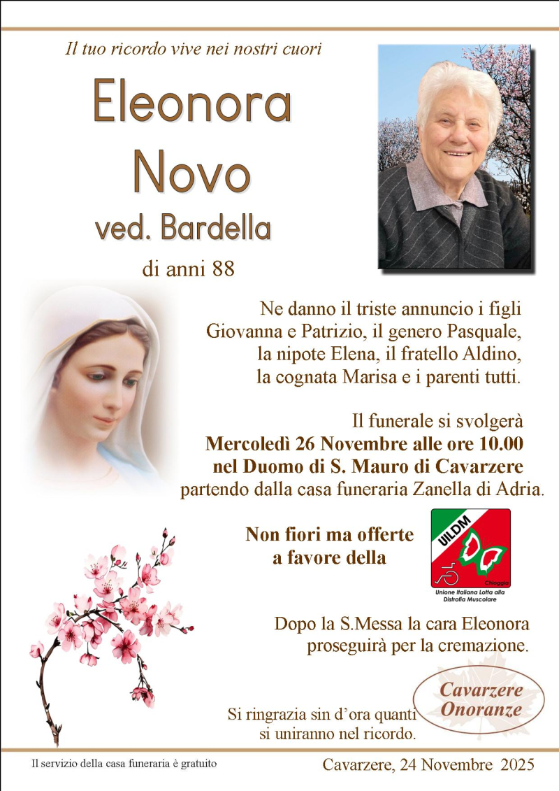 Daremo l'ultimo saluto alla cara ELEONORA NOVO Ved. BARDELLA Mercoledì 26 Novembre alle ore 10.00 nel Duomo di S.Mauro di Cavarzere, dove si giungerà dalla casa funeraria Zanella. Al termine si proseguirà per la cremazione.