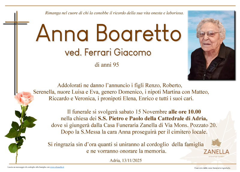 Daremo l'ultimo saluto alla cara ANNA BOARETTO ved. Ferrari Giacomo Sabato 15 Novembre alle ore 10.00 nella Cattedrale dei S.S. Pietro e Paolo di Adria dove si giungerà dalla casa funeraria Zanella. Al termine si proseguirà per il cimitero locale.