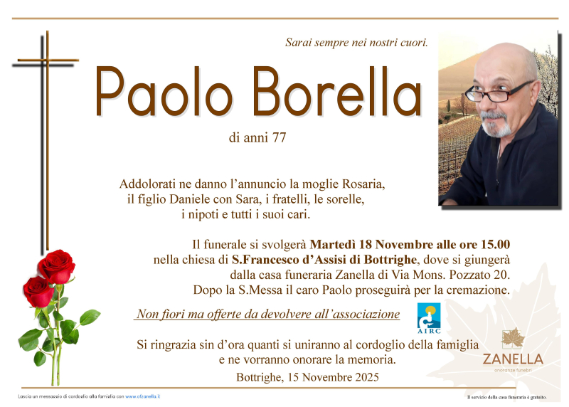 Daremo l'ultimo saluto al caro PAOLO BORELLA Martedì 18 Novembre alle ore 15.00 nella chiesa di S.Francesco d'Assisi di Bottrighe dove si giungerà dalla casa funeraria Zanella. Al termine si proseguirà per la cremazione