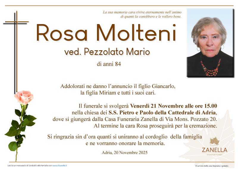 Daremo l'ultimo saluto alla cara ROSA MOLTENI ved. PEZZOLATO MARIO Venerdì 21 Novembre alle ore 15.00 nella Cattedrale dei S.S. Pietro e Paolo di Adria dove si giungerà dalla casa funeraria Zanella. Al termine si proseguirà per la cremazione.